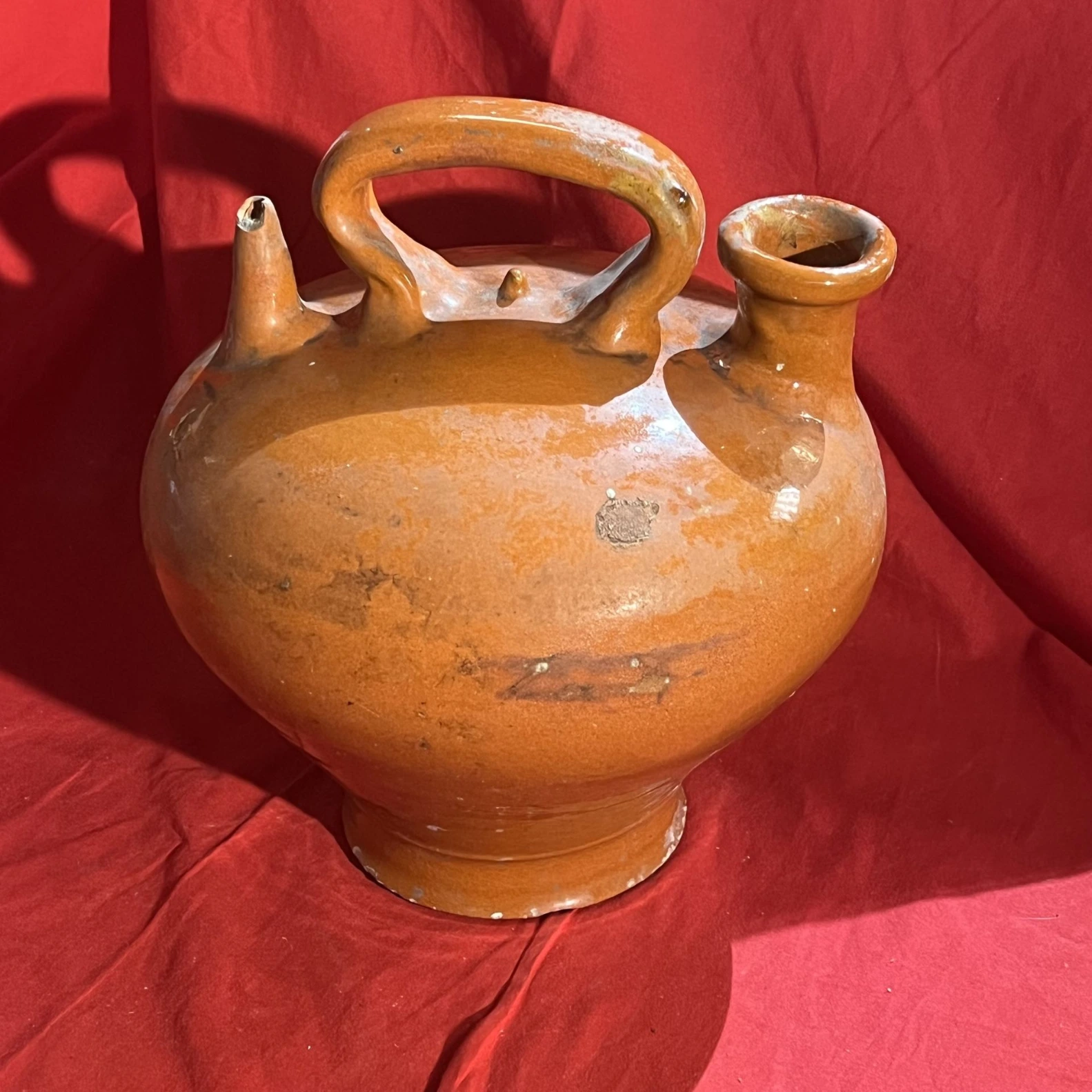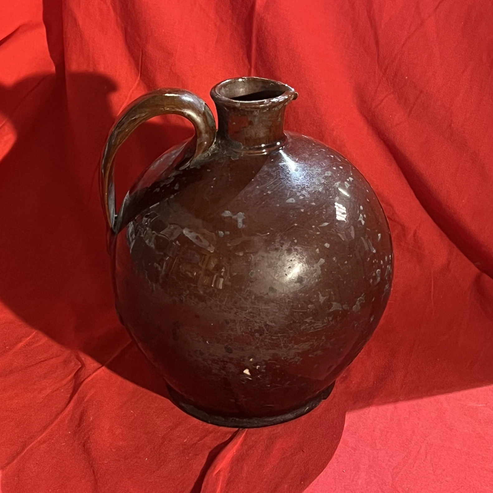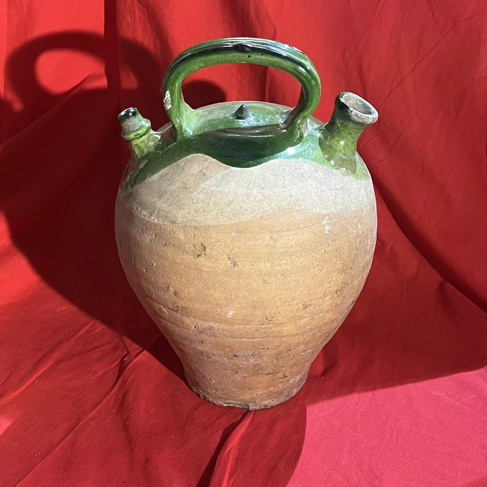 Lot de cruches anciennes en terre vernissée (brun, orange, vert), parfait pour décoration rustique.