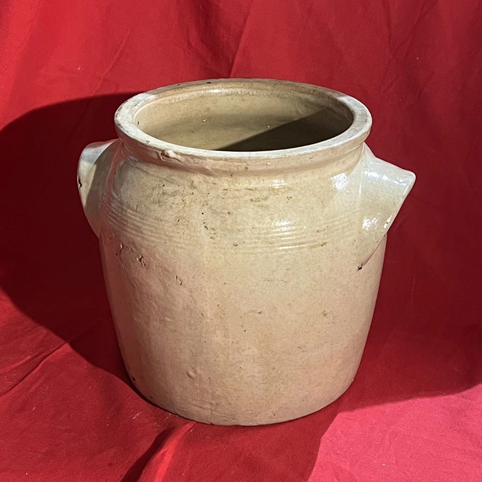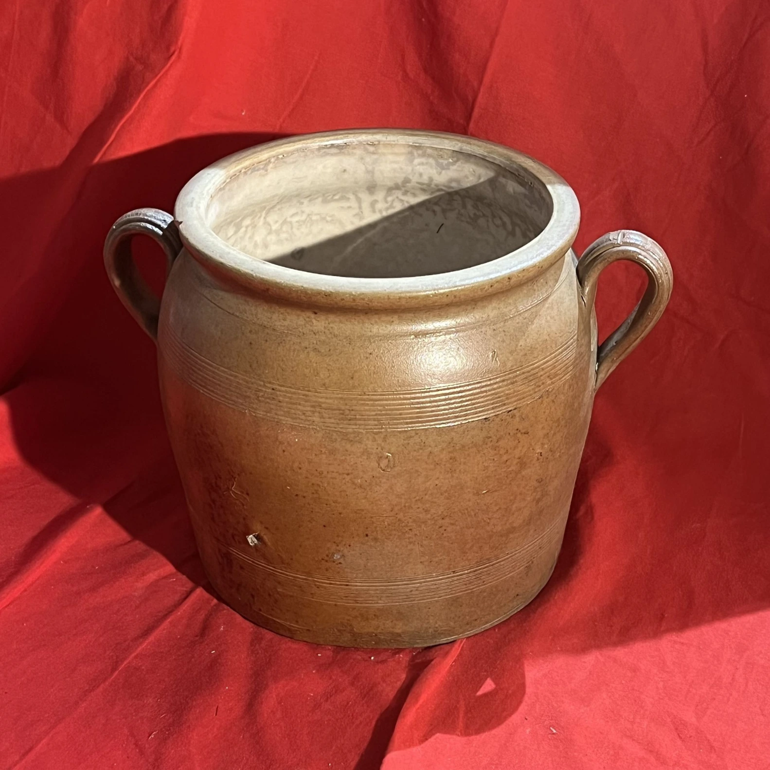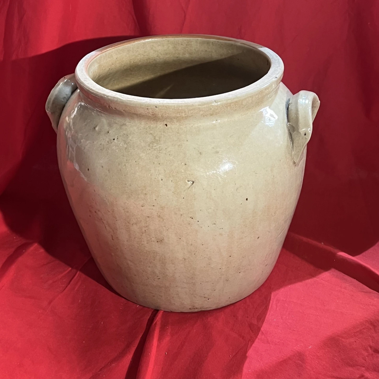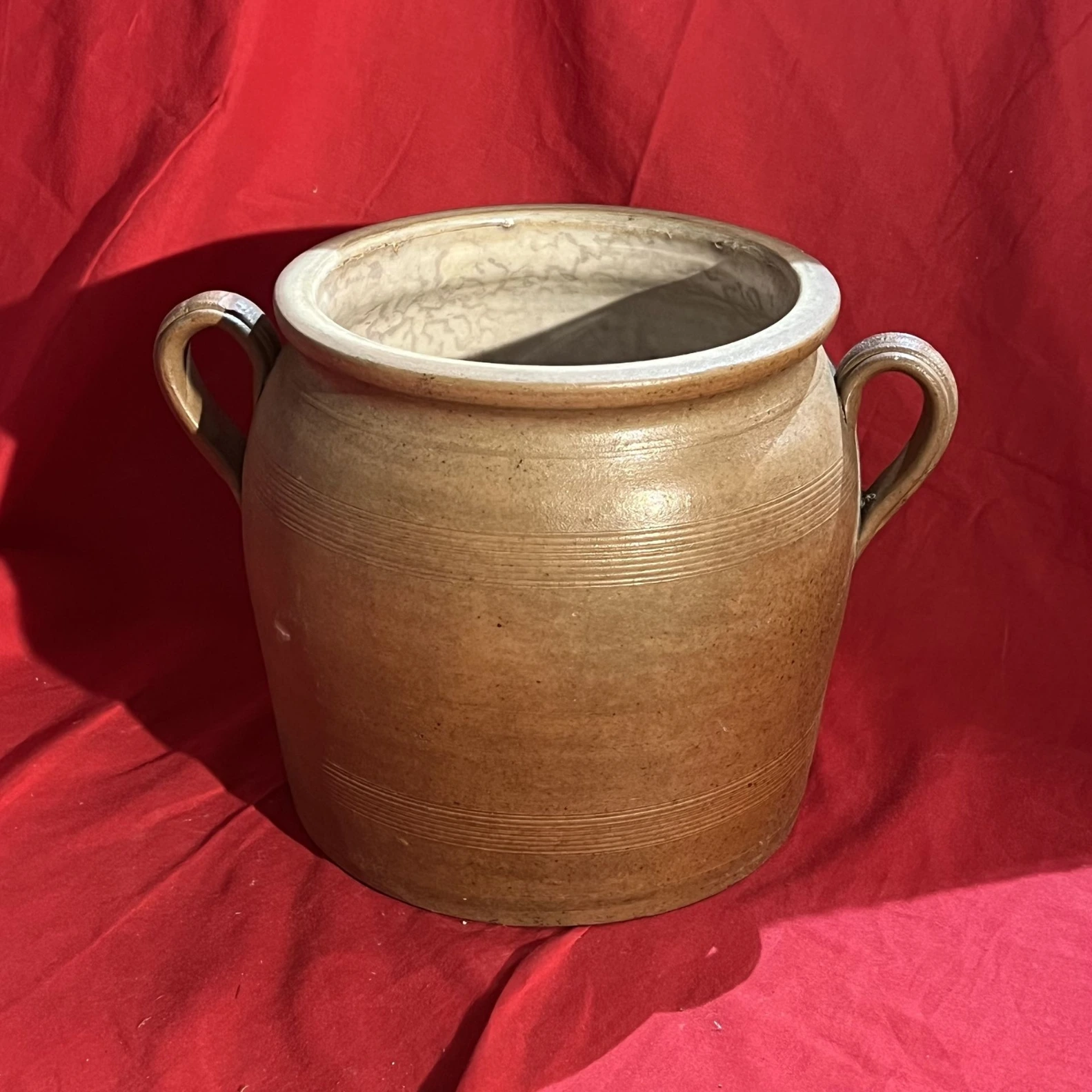Ensemble de pots en grès vernissé (beige et brun), avec anses, idéal pour décoration intérieure ou extérieure (cache-pot, cuisine rustique, brocante).