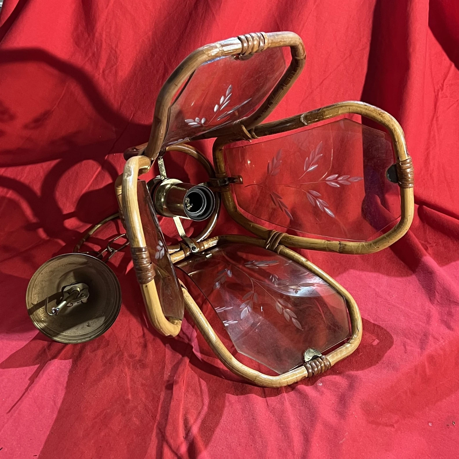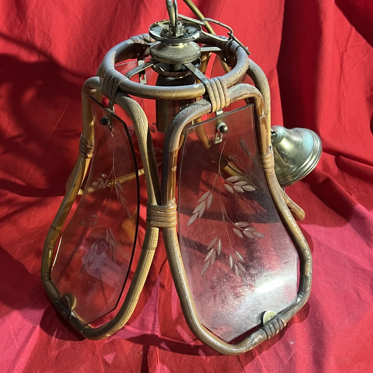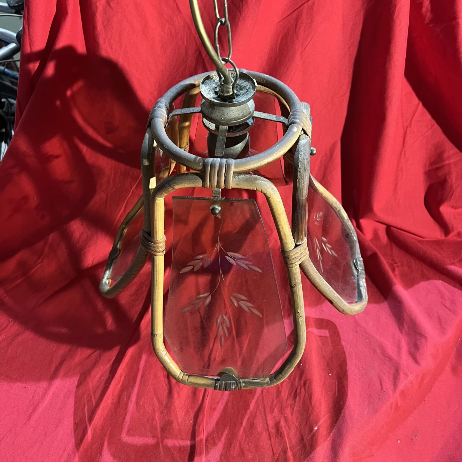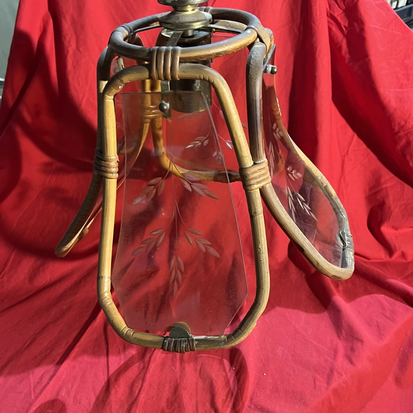 Lampe suspension vintage en verre et bambou. Dessins sur le verre.