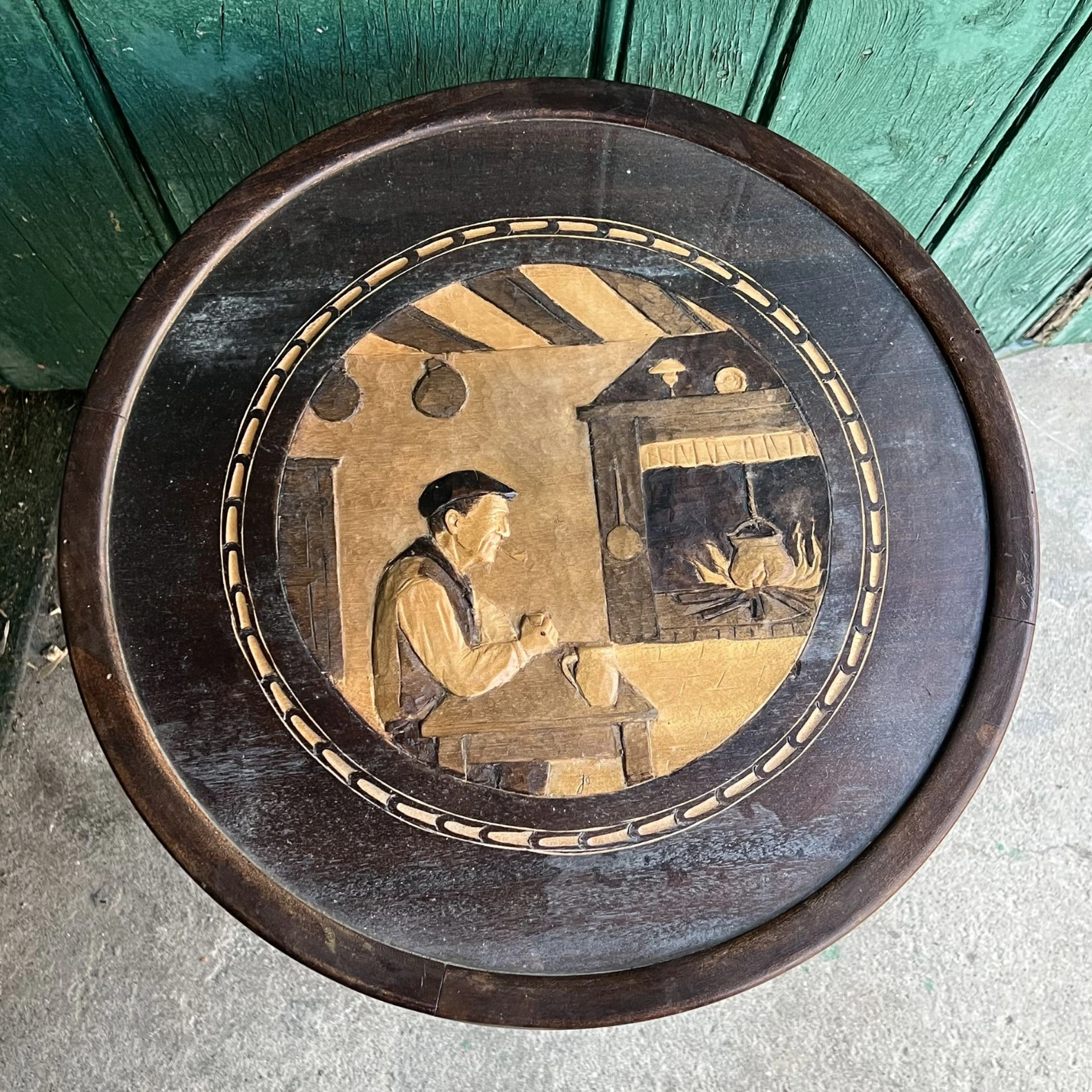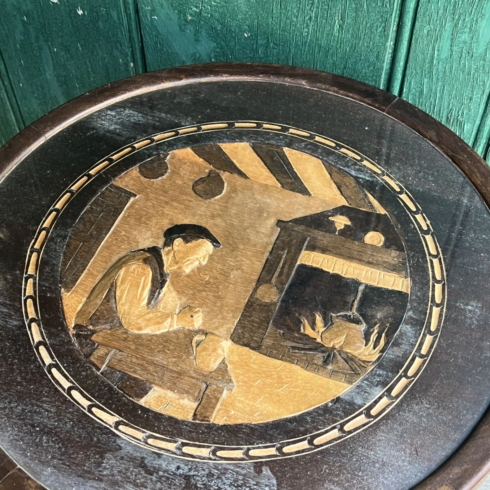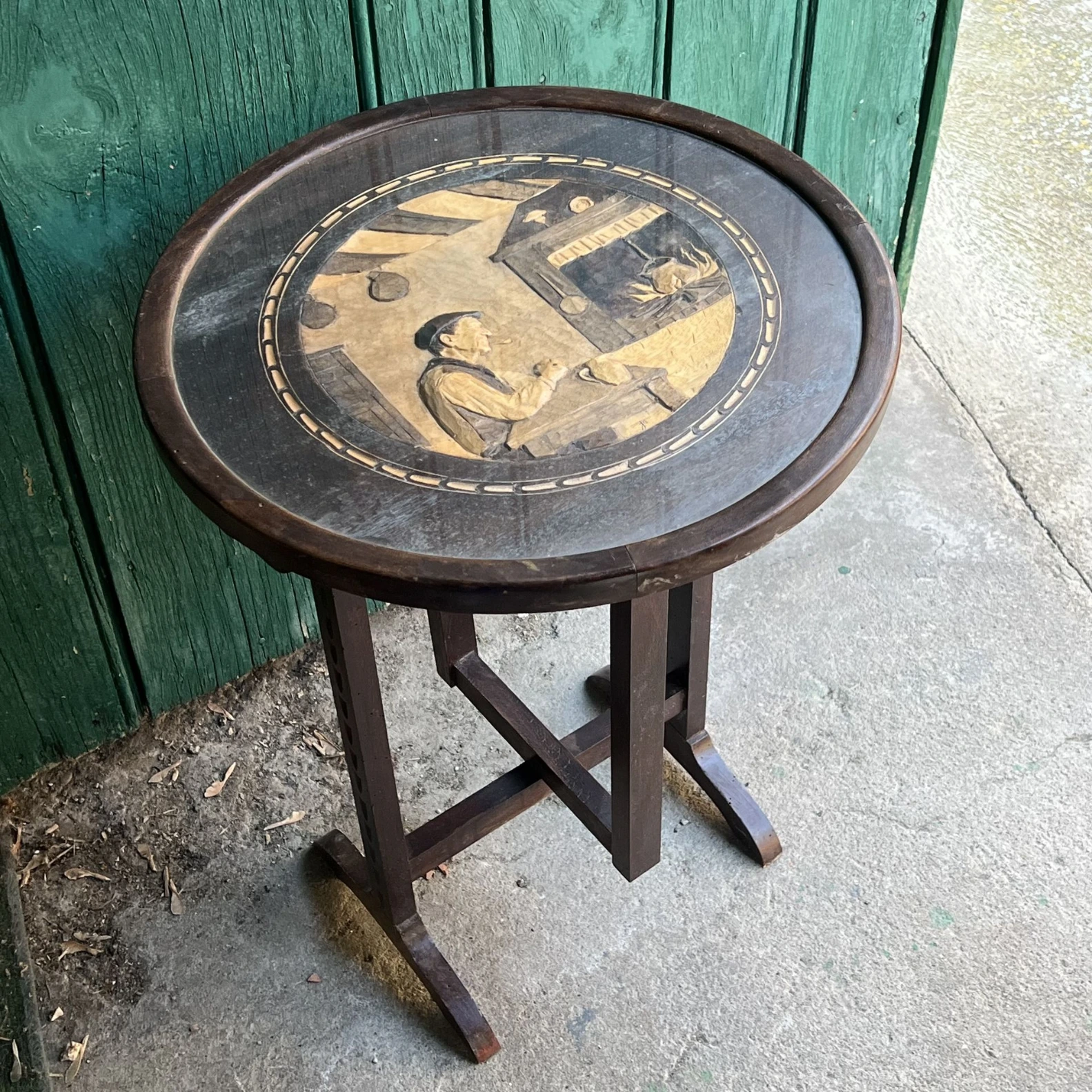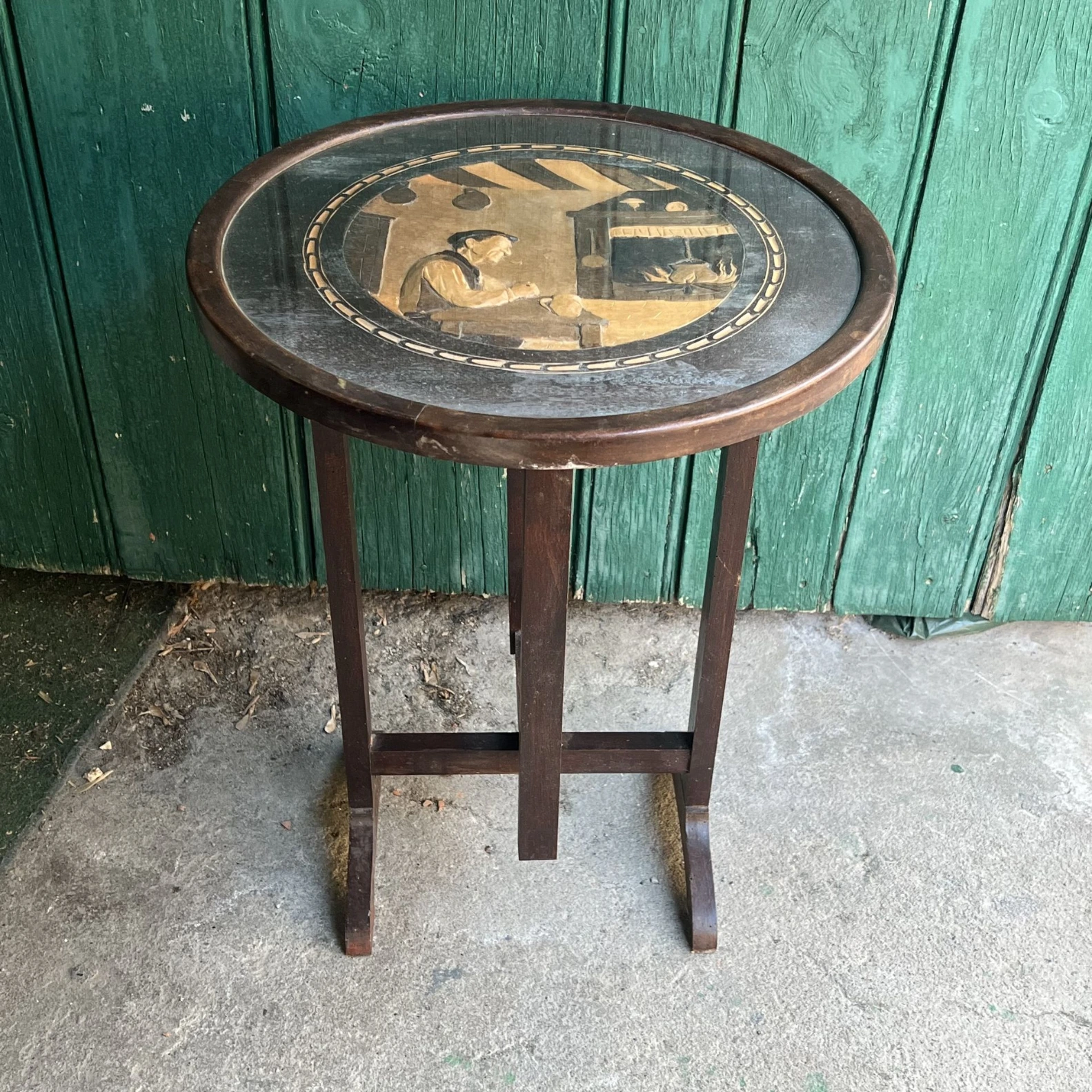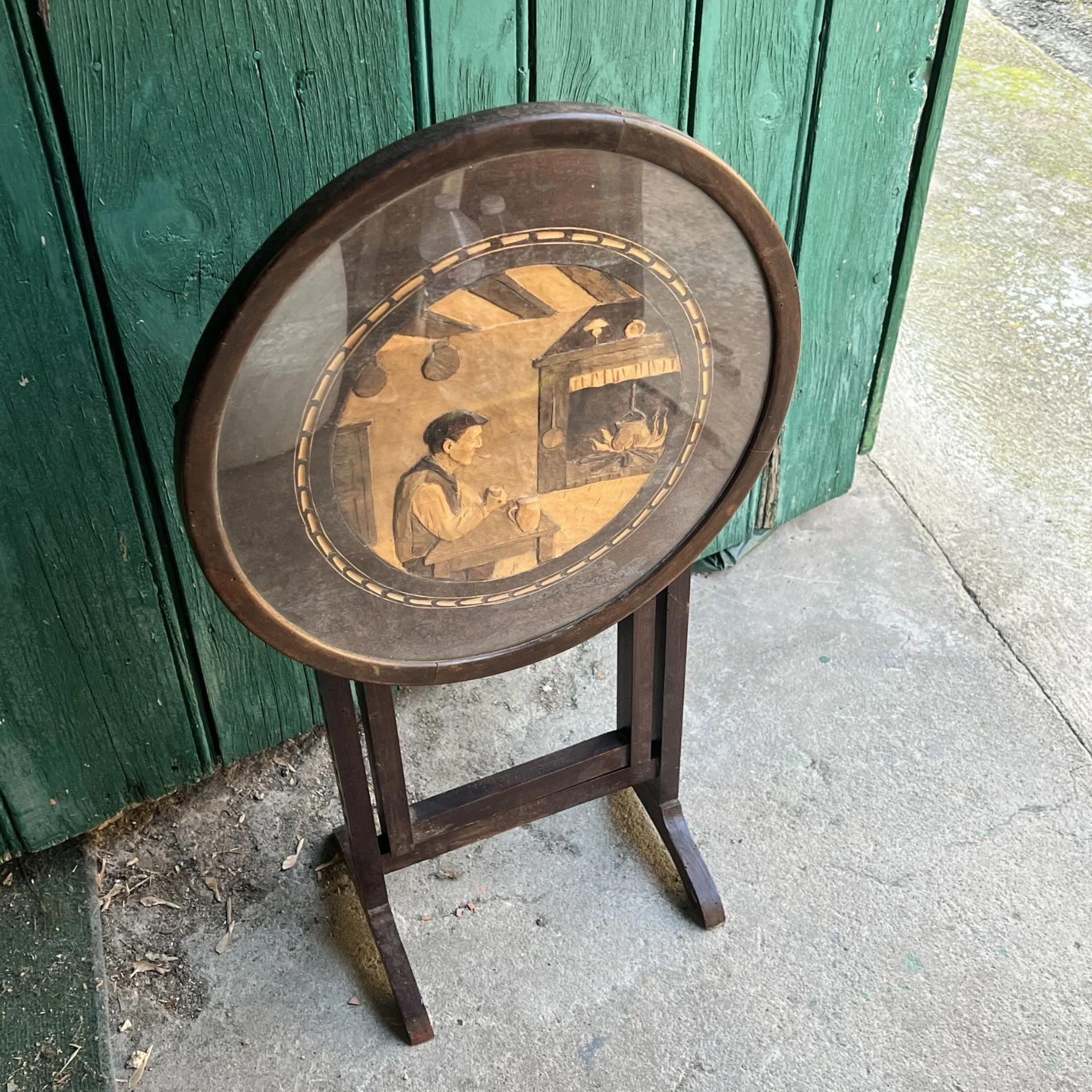 Table pliante ronde avec plateau décoratif style vintage.